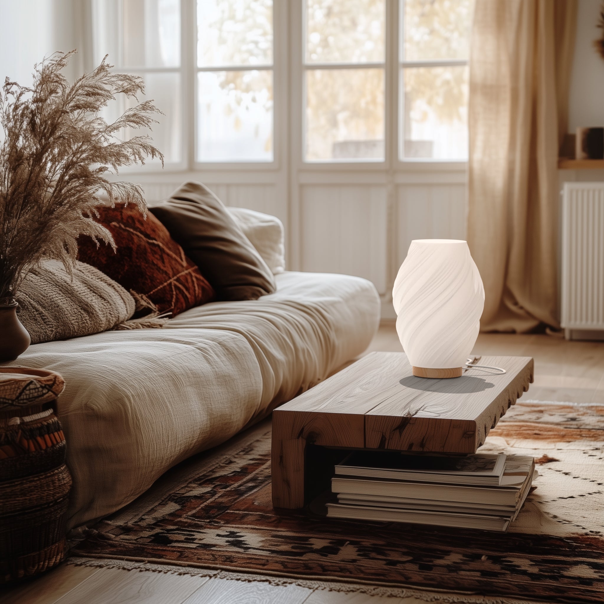 Inspirée par la force des tourbillons, Tourbillon séduit par ses courbes fluides et son élégance moderne. Imprimée en 3D en France avec des matériaux écoresponsables, elle diffuse une lumière douce et chaleureuse qui sublime les intérieurs audacieux et raffinés.