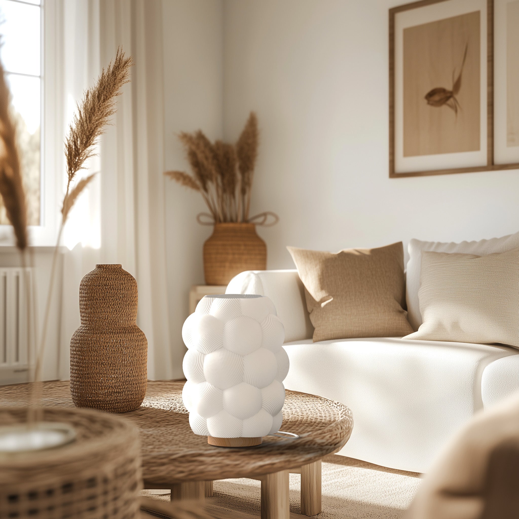 Imprimée en 3D en France avec des matériaux écoresponsables, elle diffuse une lumière douce et chaleureuse qui sublime les intérieurs audacieux et raffinés.