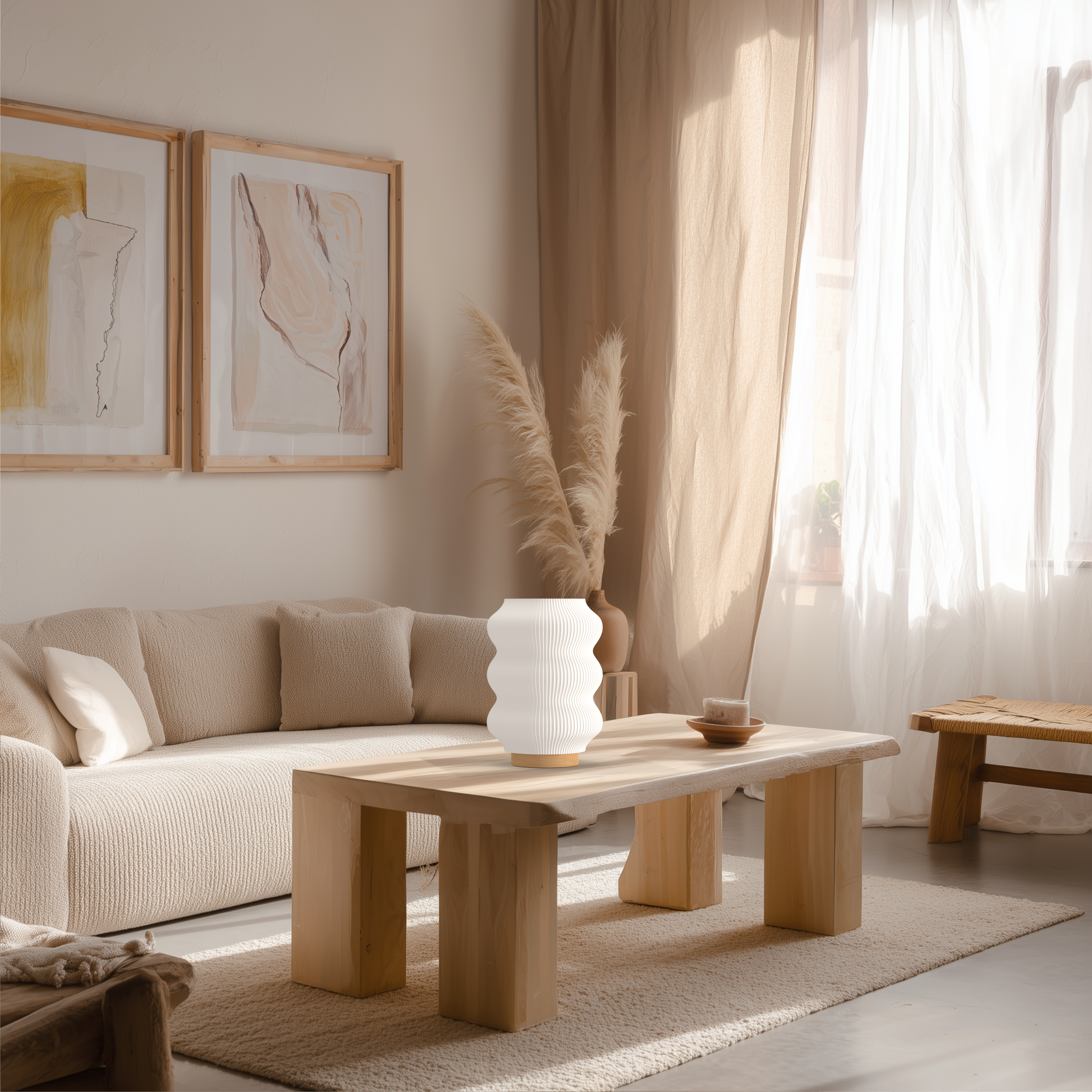 Imprimée en 3D en France avec des matériaux écoresponsables, elle diffuse une lumière douce et chaleureuse qui sublime les intérieurs audacieux et raffinés.