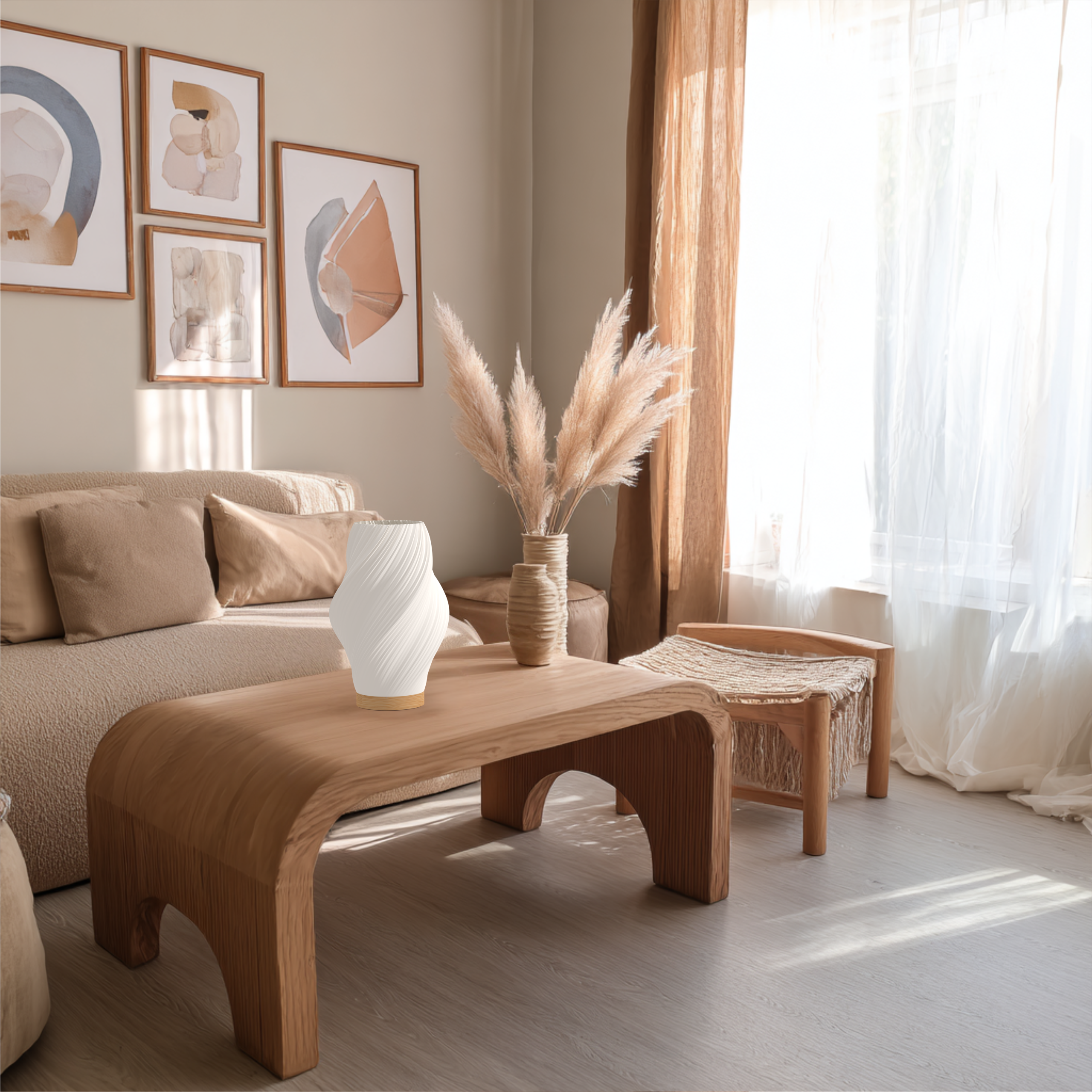 Imprimée en 3D en France avec des matériaux écoresponsables, elle diffuse une lumière douce et chaleureuse qui sublime les intérieurs audacieux et raffinés.