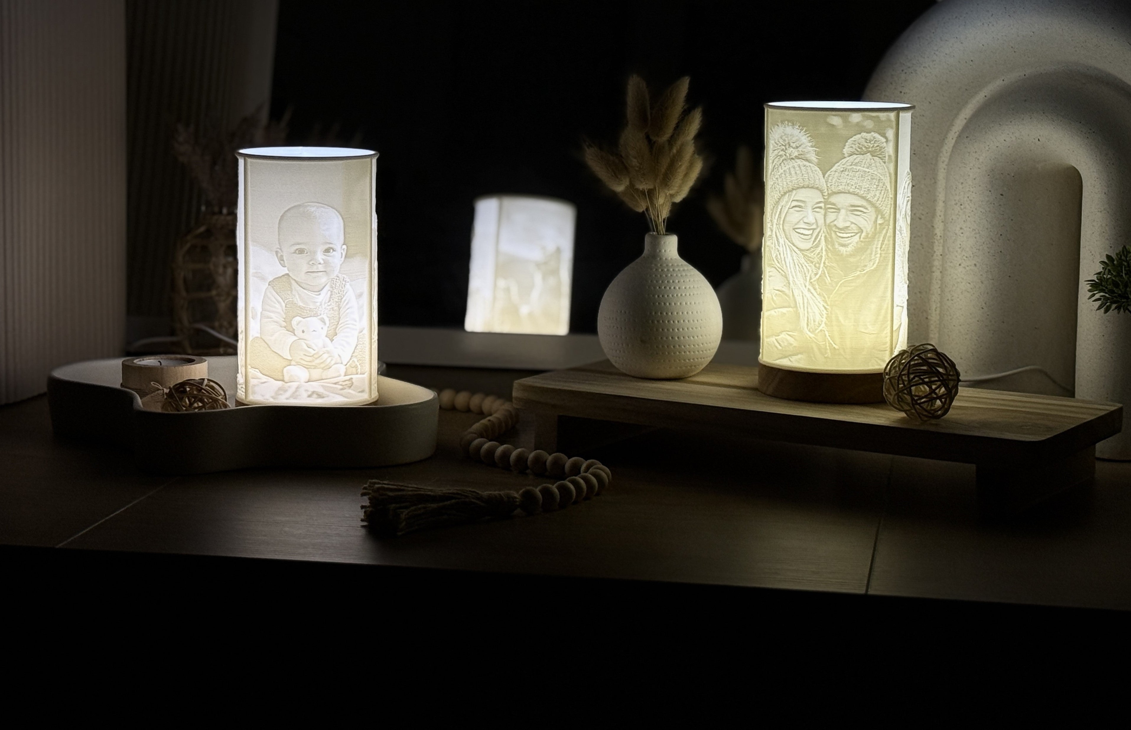 Nous vous proposons des lampes personnalisables affichant 3 images de votre choix. Une fois allumée, votre lampe dévoile vos photos avec un rendu unique et captivant.