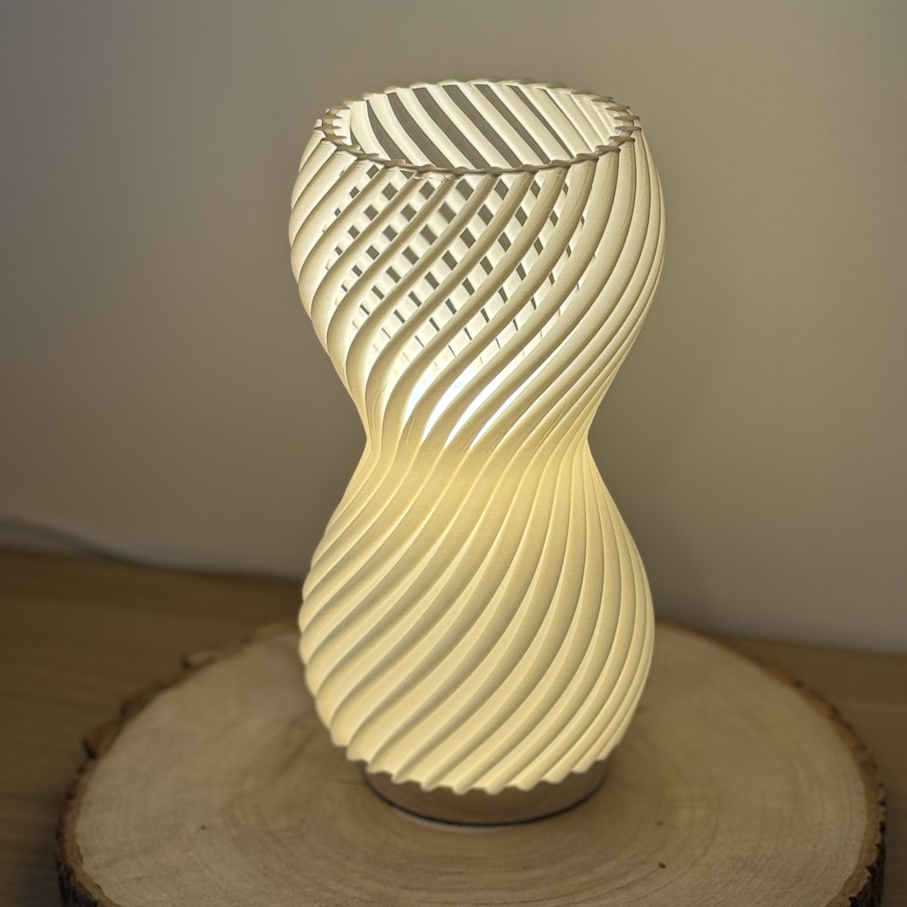 Découvrez Sablier, une lampe sculpturale au design hypnotique. Inspirée par le mouvement fluide du temps, ses courbes torsadées évoquent le passage délicat du sable dans un sablier. Sa structure ajourée joue avec la lumière et les ombres, créant des effets visuels fascinants. Parfaite pour une ambiance élégante et apaisante, que ce soit sur une étagère, une table de chevet ou un bureau.